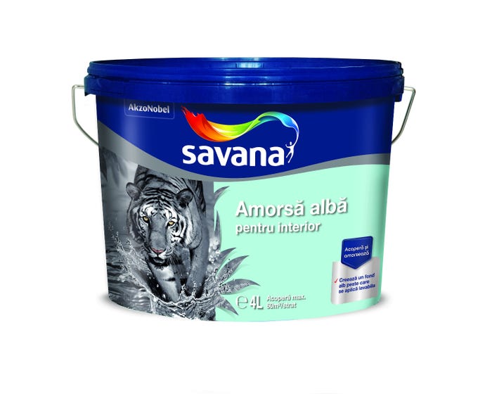 Savana este o amorsa pe baza de copolimeri sintetici in dispersie apoasa, materiale de umplutura, aditivi. Aceasta consolideaza suportul pentru finisare, confera aspect uniform vopselei, reduce consumul de material de finisare ( vopsea ), mareste aderenta vopselei la suport si formeaza o bariera la saruri. Permite aplicarea unui singur strat de vopsea lavabila Savana Unistrat, creeaza un fond alb peste care se aplica vopseaua lavabila si are dublu rol: acopera si amorseaza. Amorsarea se realizeaza la interior, pe pereti si tavane din ciment, mortar, beton, gips - carton, pe pereti tencuiti si alte suprafete minerale, in vederea cresterii aderentei peliculelor ulterioare de vopsea lavabila. Aceasta este gata de aplicare si nu se dilueaza. Suprafetele suport trebuie sa fie perfect uscate, stabile, rezistente, curate, lipsite de praf sau grasimi si uniform din punct de vedere al culorii, texturii si tipului de material. Aplicarea se realizeaza in 1 - 2 straturi, in functie de porozitatea suprafetei. Randamentul teoretic de aplicare este 12 - 15 mp / L / 1 strat. Temperatura produsului la aplicare, a suprafetei si a mediului trebuie sa fie cuprinsa intre 10ºC si 30ºC. Savana amorsa alba pentru interior se ambaleaza in recipiente din material plastic, bine inchise, de 4 L.